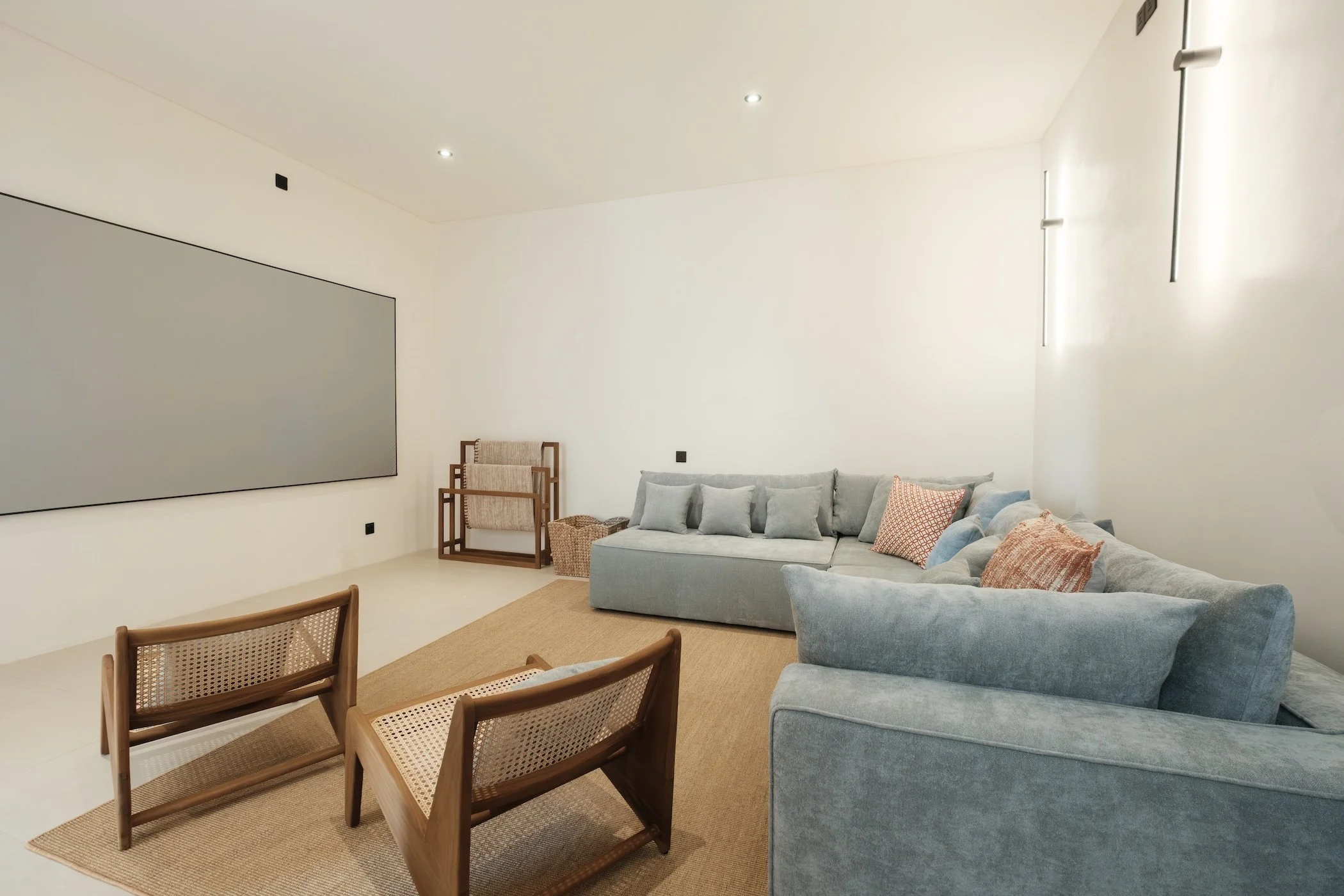 A dedicated media room equipped with a 120-inch screen with projector and Dolby surround sound system.
